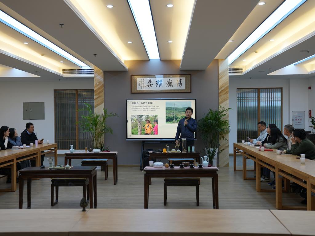 活动特邀请了经济管理学院凡丹老师讲授中国非物质文化遗产-沉香文化。分别从沉香的来源、沉香文化、沉香的价值等几方面教会大家认识沉香、鉴别沉香、品沉香。现场气氛热烈、互动频频,通过实物的触摸、现场闻香以及答疑,真切地体验沉香世界的奥妙,沉浸式体验了一次中华传统香文化。接着,经济管理学院学生和学校茶艺社同学分别给现场人员进行了篆香、点茶技艺表演,内容丰富多彩。